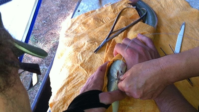 „Pak se ryba musí uspat, aby nic necítila a nehýbala se. Deset centimetrů dlouhou vysílačku zapouzdřenou ve speciálním obalu zašije do dutiny břišní veterinární lékař,“ popsal operaci Musil.
