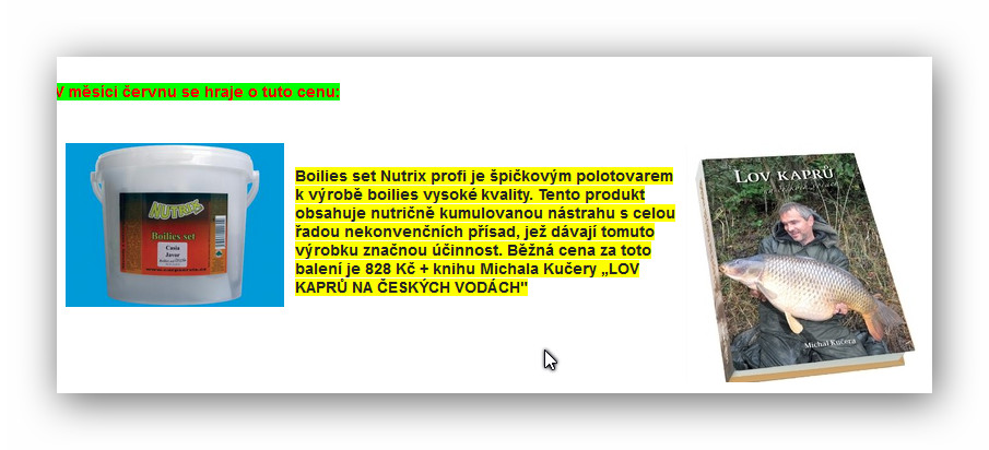 Rybářský server www.nachytano.cz vyhlašuje soutěž, která potrvá od 1.4.2013 do 30.11.2013. Soutěž je velice jednoduchá pro všechny účastníky a není podmíněná registrací na webu. Jde o vkládání fotografií z Vašeho lovu do zřízených sekcí na vebu Nachytáno.cz. Každý měsíc bude jeden z Vás vylosován a obdrží zajímavou cenu. Nezáleží na velikosti úlovku, každá ryba je krásná bez rozdílu. Pokud se vyskytne v daném měsíci nějaká opravdu zajímavá a či něčím působivá fotografie, bude oceněna zvláštní cenou.