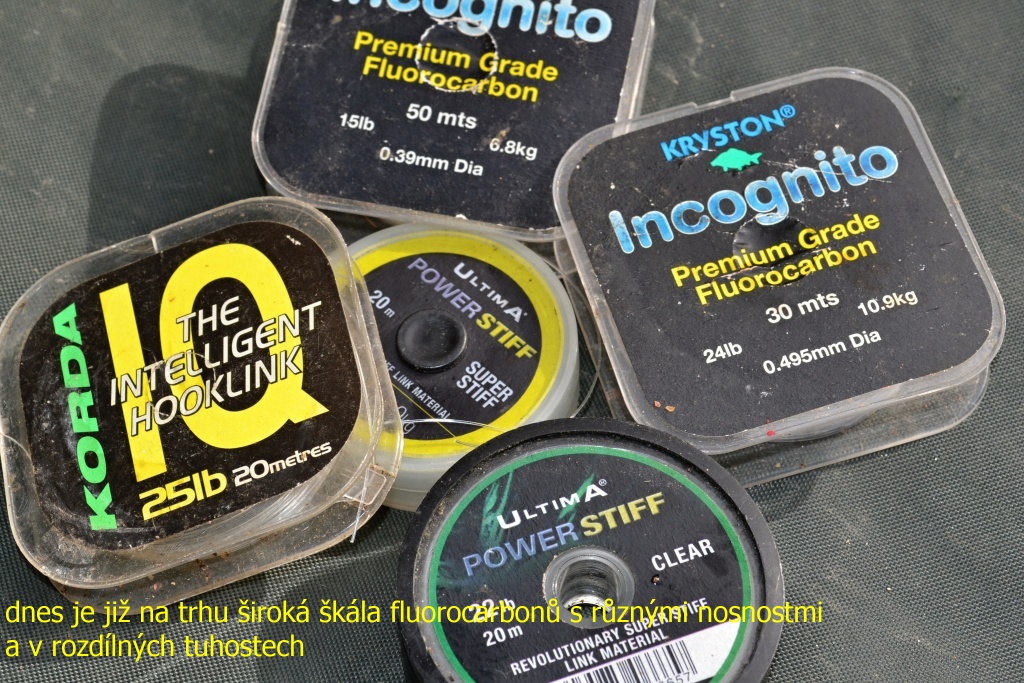 Další z věcí, která se v posledních letech stala velice používanou, je fluorocarbon. Na první pohled se na něm nic neliší od klasického monofilního vlasce. Fluorocarbon má ale výhodu ve větší hustotě materiálu a tím vyššíí hmotnosti při stejném průměru. To nám