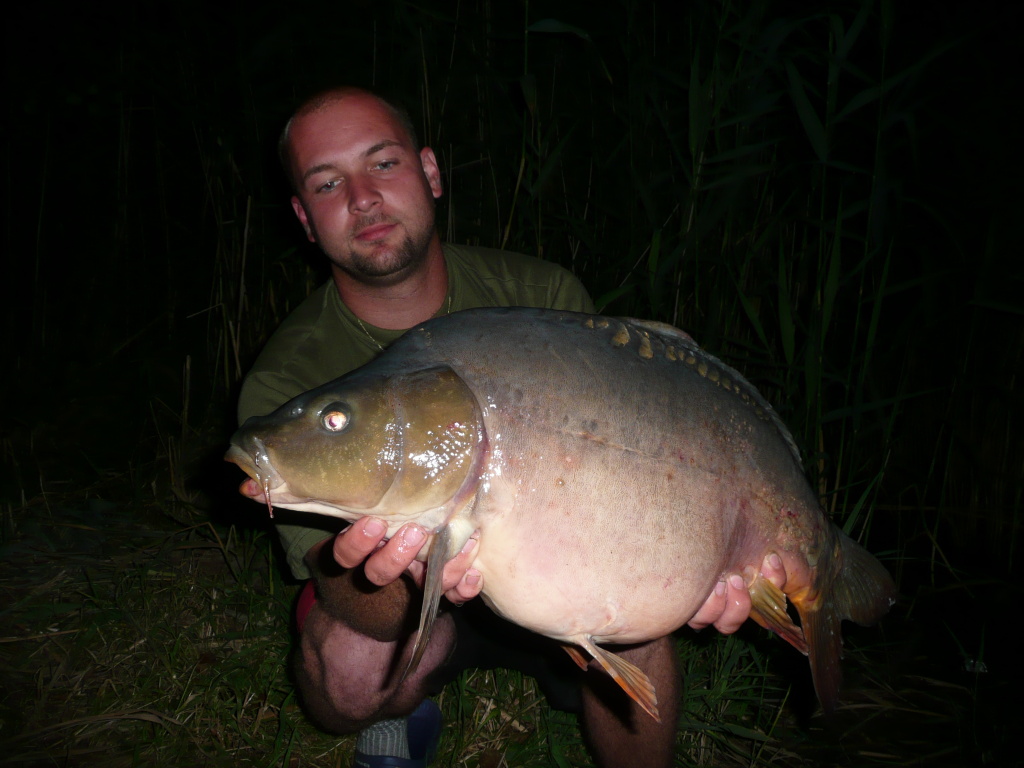 Zanedlouho padla úplná tma, ale já jsem byl stále bez záběru. Ani mně to příliš nevadilo. Užíval jsem si nočního klidu a krásného počasí. V mé mysli se proháněli velcí candáti, kteří jako smečka vodních psů pronásledují hejno drobných rybek, když potom narazí na mou snadně dostupnou potravu a s velkým potěšením ji uchopí do svých velikých zubů. Tok myšlenek mi však přerušilo silné mlasknutí či srknutí, které se ozvalo velice blízko mě. Nepopírám, že jsem se pořádně lekl. Než jsem se stačil rozhlédnout a zjistit, co tento zvuk způsobilo, ozvalo se to podruhé, potřetí, počtvrté. Můj zrak spočinul na kůrkách chleba a pečivu, které teď bylo naplavené přímo pod mými pruty. Ve svitu měsíce bylo nezřetelně vidět několik kaprů, jak nerušeně holdují plovoucí potravě. Seděl jsem v křesílku jako zkamenělý a pozoroval jsem tuto fascinující scenérii. Kapři se krmili necelý metr od mých nohou. Chtěl jsem je vidět v jejich plné kráse a taky jsem byl velmi zvědavý, jak jsou ryby velké. Na své čelové svítilně mám červený filtr, jehož světlo prý ryby neplaší. Rozhodil jsem se tedy zariskovat a čelovku rozsvítit. Očekával jsem výbuch vyplašení, až na kapry
