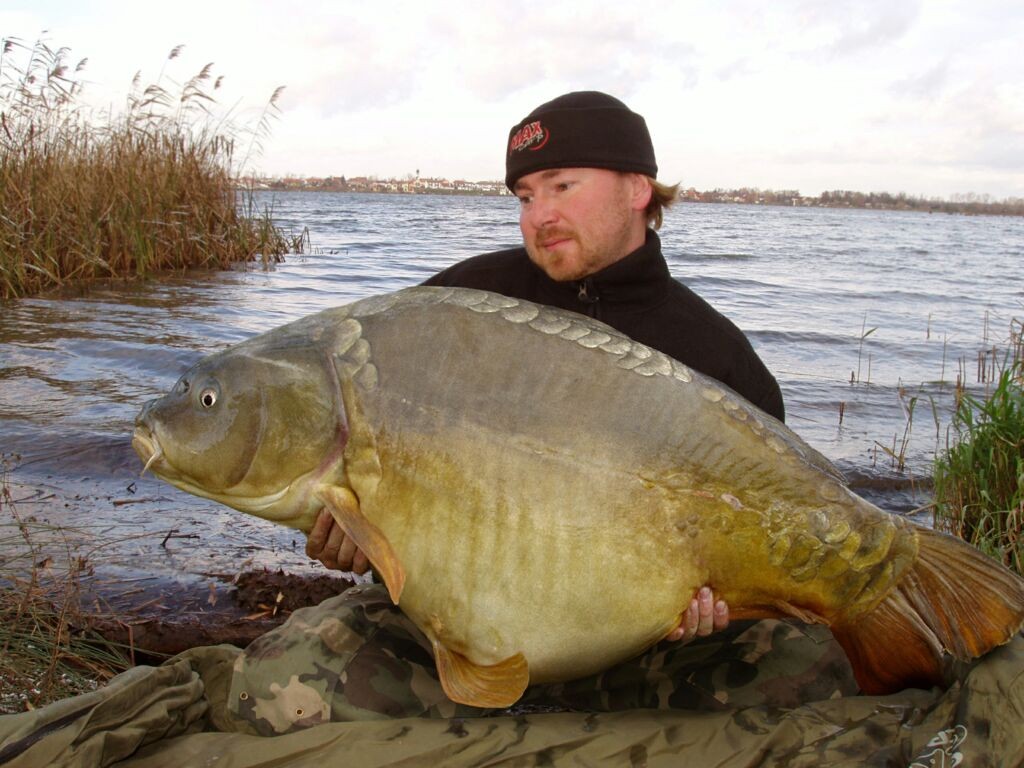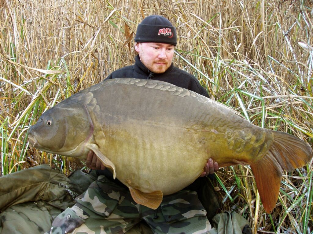nečekal a na poprvé jej podebral. Přišlo mi, že teprve teď si kapr uvědomil co se děje. V podběráku vyváděl jako „hřebec“. V té chvíli mi ještě nedocházelo, jakou rybu jsem ulovil. Že je dlouhá jsem tušil, ale ta mohutnost těla mi skoro vyrazila dech. Pro větší bezpečnost kapra jsme ho v síti podběráku převezli opatrně za lodí ke břehu. Po vyndání na matraci jsme na něj oba koukali jako na zjevení. Teprve zde si kapr uvědomil, že je dobojováno a klidně si ležel.