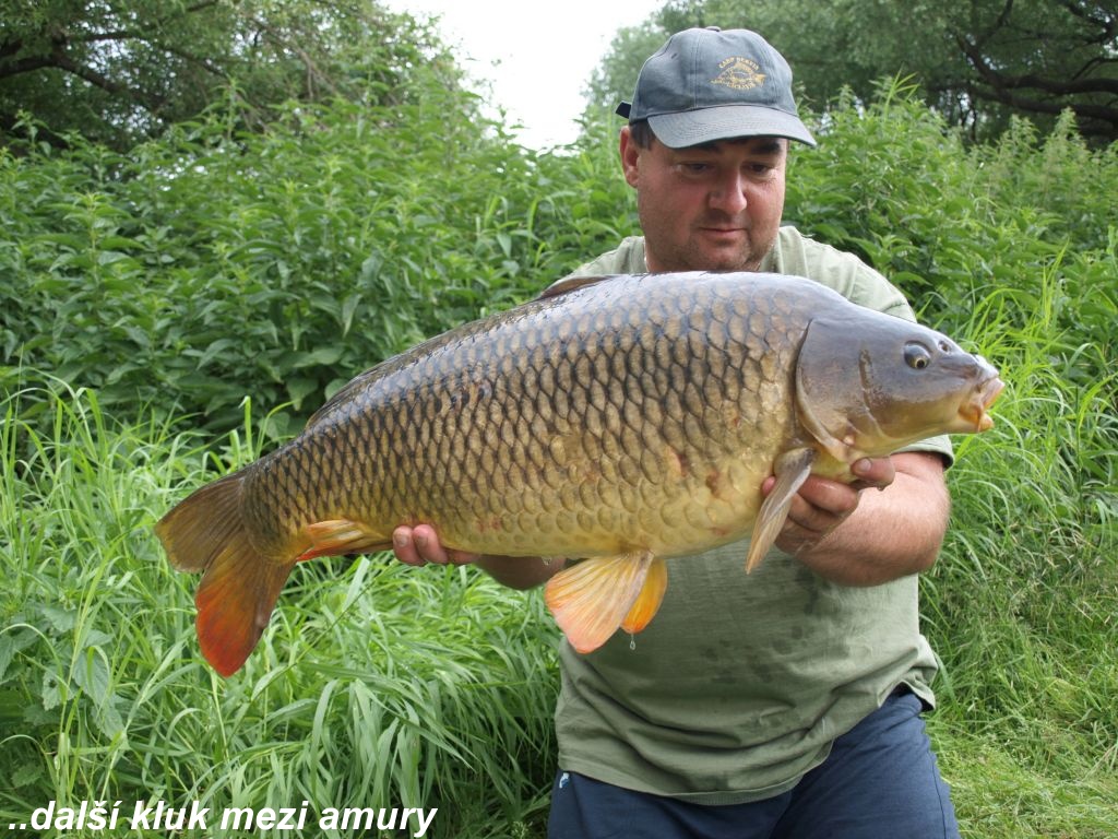 Dalším takovým omylem bylo, když jsem si jedno místo přikrmil kukuřičnými peletami. To, co se odehrálo chvíli po vhození těchto pelet do již zakrmého místa, jsem ještě nezažil. Záběry od amurů, kteří žrali vše, co jim přišlo do cesty. Co nához, to do pěti minut amur. Bylo jedno, jestli dám na montáž dvě dvacítky jater....prostě za chvilku už tam byl. Aleš jejich apetitu využil a jako vždy s sebou vozí kbelík vařené kukuřice. Tento partikl rozházel u svého místa, předělal jednu montáž, pod háček dal dvě zrnka kukuřice a jednu plovoucí kuličku Scopex/Ananas 10 mm a zábava se rozjela na plný pecky. Největší zdolaný amur byl kolem metru. Mezi bohatýry se ulovilo i několik kaprů do deseti kilogramů.