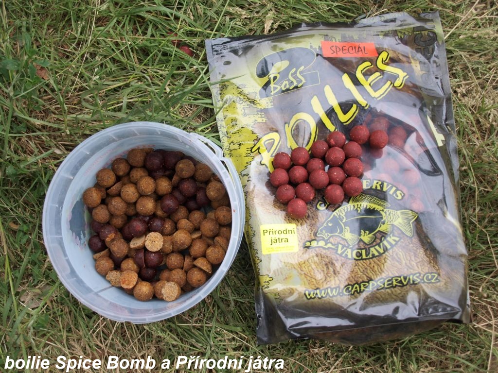 Své krmné místo jsem si zakrmil předem máčeným boiliem BOSS2 Přírodní játra ve 20 mm a druhé, vzdálenější místo silně kořeněným boiliem od CARP ZOOM Spice bomb rovněž ve 20 mm doplněnou plovoucí kuličkou Sherry/Crab v 16 mm tzv. na panáčka. Obě montáže jsem ještě doplnil o PVA pásku s jednou celou kuličkou a jednou půlenou. Při použití PVA materiálu se vám montáž při náhozu nezamotává, ale to už dnes přeci každý ví a zná.