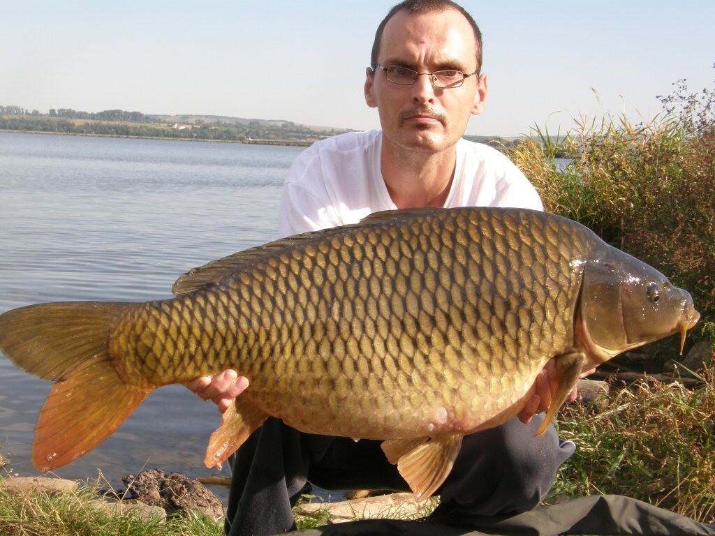 Několik dalších dní jsme neměli záběr. Z nostalgie mě několikátý den odpoledne v 15h překvapila jízda. Na hrázi mě během zdolávání pozorovalo několik lidí. Při přitahování jsem cítil, že to bude další větší kapr. Jen to nepokazit - v hlavě se mi honilo, hlavně o něj nepřijít. Přitáhl jsem kapra blíž a po vynoření jsem zahlédl velikého šupináče. Po chvilce skončil naštěstí v podběráku. Jeho míry 95cm a váha ukázala 15,5kg. Krásný veliký šupináč. V tlamce měl zahojenou ranku po jiném zdolání.. Kapříkovi zachutnaly dvě potápivé kuličky A1-roll (ky).