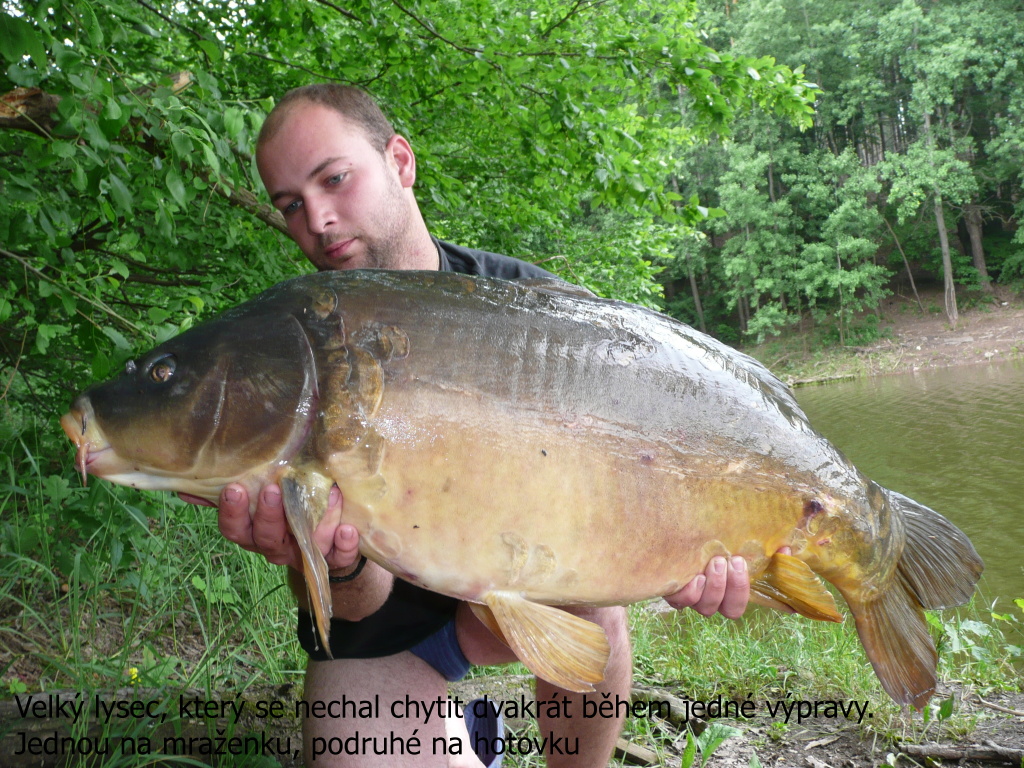 Rozhodl jsem se dát na jednu montáž „mraženku“ a na druhou „hotovku“ a skutečně tak oba výrobky mezi sebou porovnat. Už přesně nevím, kolik ryb nachytalo to nebo ono boilie. Stala se však jiná zajímavost. Třetí den výpravy se mi podařilo zdolat na „mraženku“ velkého lysce. Přiznám se, že jsem v duchu opět začal dávat hotovkám „vale“. Jenže pátý den přišel záběr na prut, kde bylo nastraženo konzervované boilie. Již při souboji mě bylo jasné, že se jedná o velkou rybu. Ke břehu jsem přitáhl opět velikého lysce. V tu chvíli, kdy ležela ryba na podložce, jsem si všiml, že je to ten samý kapr, kterého jsem zdolal před dvěma dny na „mraženku“!